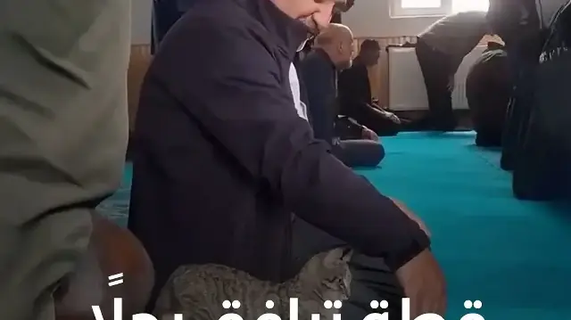 لقطة لطيفة تظهر قطة صغيرة ترافق رجلاً تركيًا في طريقه إلى المسجد، وتبقى بقربه بهدوء أثناء أدائه الصلاة داخل أحد مساجد إسطنبول.