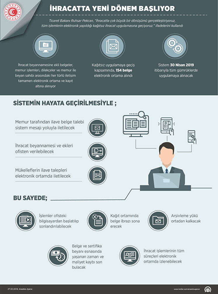 Ticaret Bakanı Pekcan, "İhracatta çok büyük bir dönüşümü gerçekleştiriyoruz, tüm işlemlerin elektronik yapıldığı kağıtsız ihracat uygulamasına geçiyoruz" dedi. Pekcan, sistemin 30 Nisan itibarıyla tüm gümrüklerde uygulanacağını açıkladı.