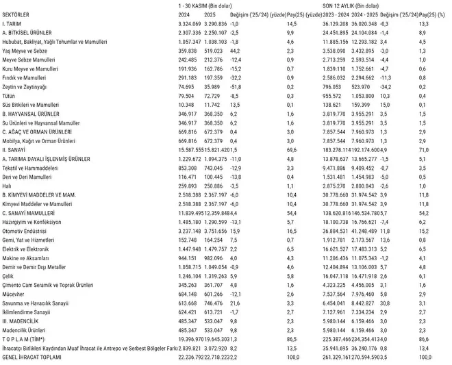 TİM verilerine göre, sektörel bazda 2024 ve 2025'in kasım ayları ve son 12 aylık ihracat verileri, değişim oranları ve toplam içindeki payları şöyle (bin dolar)