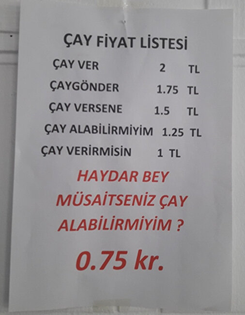 Bal, ‘Çay ver’ diyenden 2 TL, ‘Çay gönder’ diyenden 1.75 TL, ‘Çay versene’ diyenden 1,50 TL, ‘Çay alabilir miyim’ diyenden 1.25 TL, ‘Çay verir misin’ diyenden 2 TL, ‘Haydar bey, müsaitseniz çay verir misiniz’ diyenden ise 75 kuruş alacağına dair bir liste hazırladı, listeyi de dükkanının duvarına astı. Bu fikri sosyal medyada gördüğüne değinen Muharrem Bal, yapılan bu uygulamanın aslında şakadan ibaret olduğuna dikkat çekti.