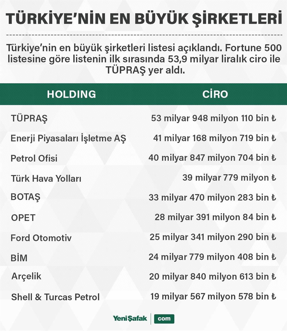 Türkiye’nin en büyük şirketleri listesi açıklandı. Fortune 500 listesine göre listenin ilk sırasında geçen yıl olduğu gibi bu yıl da 53,9 milyar liralık ciro ile TÜPRAŞ yer aldı. TÜPRAŞ'ın ardından ilk üçte ise 40 milyar liranın üzerindeki ciroları ile Enerji Piyasaları İşletme AŞ ve Petrol Ofisi yer aldı.