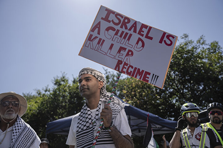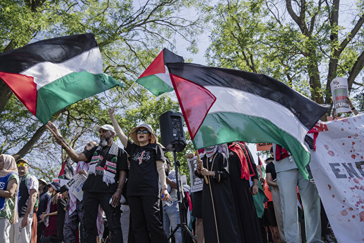 İsrail'in Gazze'ye yönelik saldırılarını protesto göstericiler, ellerinde Filistin bayrakları ve Gazze'de ateşkesin sağlanmasını talep eden pankartlar taşıdı.