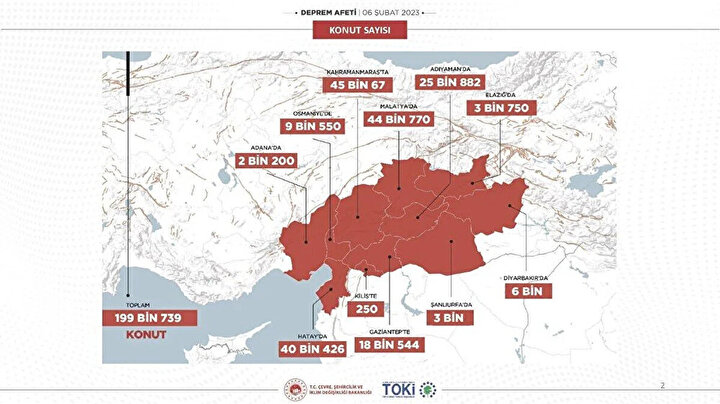 Bu kapsamda biliyorsunuz; Adıyaman, Gaziantep ve Kilis'te toplamda 1797 konutumuzun sözleşmelerini imzaladık ve inşaat sürecine başladık. Adana'da 590, Gaziantep'te 600, Hatay'da 364, Kahramanmaraş'ta 1019, Şanlıurfa'da 534 olmak üzere 3 bin 107 yeni yuvamızın sözleşmesini imzaladık.
