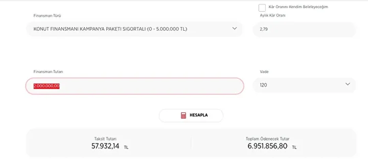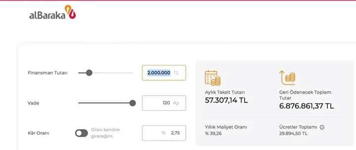Albaraka’nın 2,75’lik aylık kar oranı hesaplamasında konut finansman paketi, 2 milyon TL'lik kredi finansmanı ve 120 ay vadeli seçeneğinde aylık taksit tutarı 57 bin 307 TL olarak sağlanıyor. Toplam geri ödeme tutarı ise 6 milyon 876.861 TL.