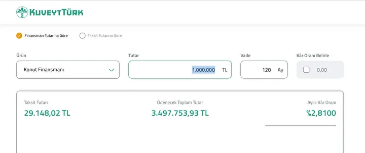 Kuveyt Türk’ün 2,81’lik aylık kar oranı hesaplamasında konut finansman paketi, 1 milyon TL'lik kredi finansmanı ve 120 ay vadeli seçeneğinde aylık taksit tutarı 29 bin 148 TL olarak sağlanıyor. Toplam geri ödeme tutarı ise 3 milyon497.753 TL.