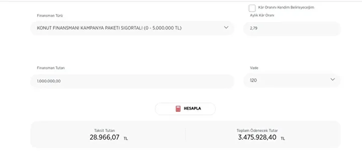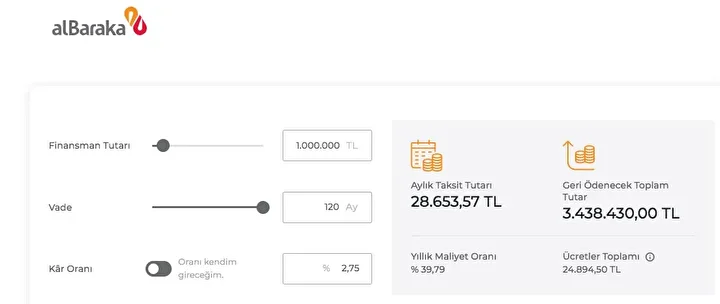 Albaraka’nın 2,75’lik aylık kar oranı hesaplamasında konut finansman paketi, 1 milyon TL'lik kredi finansmanı ve 120 ay vadeli seçeneğinde aylık taksit tutarı 28 bin 653 TL olarak sağlanıyor. Toplam geri ödeme tutarı ise 3 milyon 438.430TL.