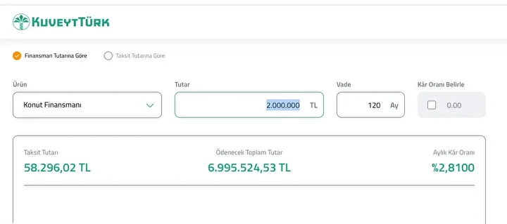Kuveyt Türk’ün 2,81’lik aylık kar oranı hesaplamasında konut finansman paketi, 2 milyon TL'lik kredi finansmanı ve 120 ay vadeli seçeneğinde aylık taksit tutarı 58 bin 296 TL olarak sağlanıyor. Toplam geri ödeme tutarı ise 6 milyon 995.524 TL.