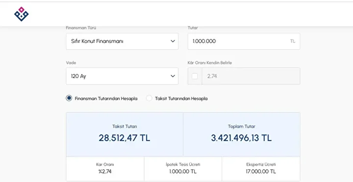 Vakıf Katılım'ın 2,74’lük aylık kar oranı hesaplamasında sıfır konut finansman paketi, 1 milyon TL'lik kredi finansmanı ve 120 ay vadeli seçeneğinde aylık taksit tutarı 28 bin 512 TL olarak sağlanıyor. Toplam geri ödeme tutarı ise 3 milyon 421 bin 496 TL.