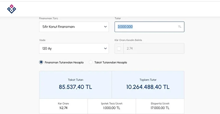 Vakıf Katılım'ın 2,74’lük aylık kar oranı hesaplamasında sıfır konut finansman paketi, 3 milyon TL'lik kredi finansmanı ve 120 ay vadeli seçeneğinde aylık taksit tutarı 85 bin 537 TL olarak sağlanıyor. Toplam geri ödeme tutarı ise 10 milyon 264 bin 488 TL.