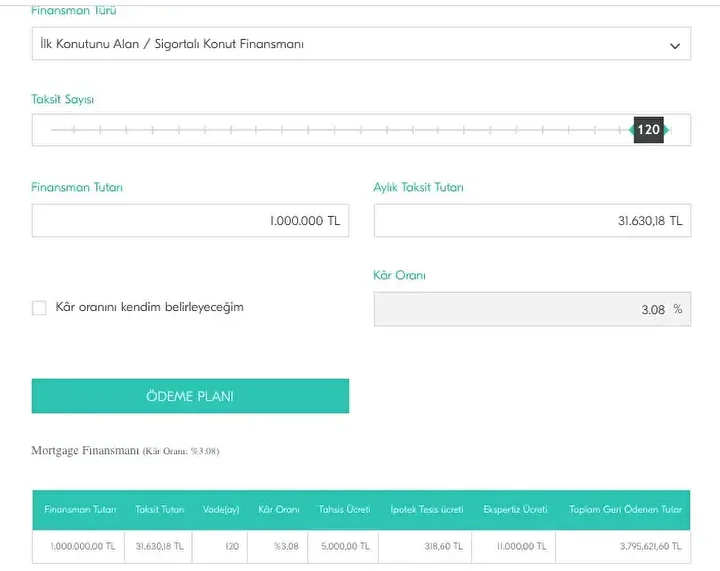Türkiye Finans’ın 3,08’lik aylık kar oranı hesaplamasında ilk konutunu alan sigortalı konut finansman paketi, 1 milyon TL'lik kredi finansmanı ve 120 ay vadeli seçeneğinde aylık taksit tutarı 31 bin 630 TL olarak sağlanıyor. Toplam geri ödeme tutarı ise 11 milyon 386.864 TL.