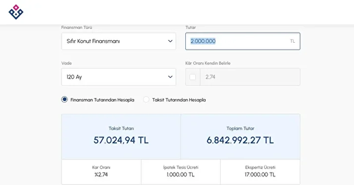 Vakıf Katılım'ın 2,74’lük aylık kar oranı hesaplamasında sıfır konut finansman paketi, 2 milyon TL'lik kredi finansmanı ve 120 ay vadeli seçeneğinde aylık taksit tutarı 57 bin 024 TL olarak sağlanıyor. Toplam geri ödeme tutarı ise 6 milyon 842 bin 992 TL.