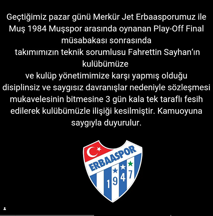 Konuyla ilgili Erbaaspor Kulübü bir açıklama yaparak, Fahrettin Sayhan'ın disiplinsiz ve saygısız davranışları nedeniyle sözleşmesinin feshedildiği belirtildi.