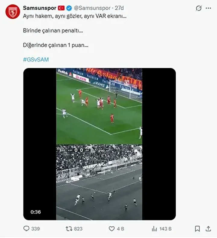 Galatasaray'ın geçtiğimiz sezon oynadığı ve maçı yine Mehmet Türkmen'in yönettiği Kayserispor deplasmanındaki Galatasaray'ın kazandığı penaltı ile kendi maçlarında yaşanan pozisyonu paylaşan Samsunspor, gönderide şu ifadeleri kullandı: