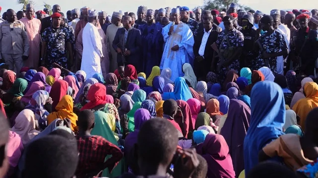 Le gouverneur de l’État de Borno, Babagana Zulum, s'est rendu dans le village de Darul Jamal pour présenter ses condoléances suite à une attaque meurtrière du groupe terroriste Boko Haram, au Nigéria, le 6 septembre 2025,