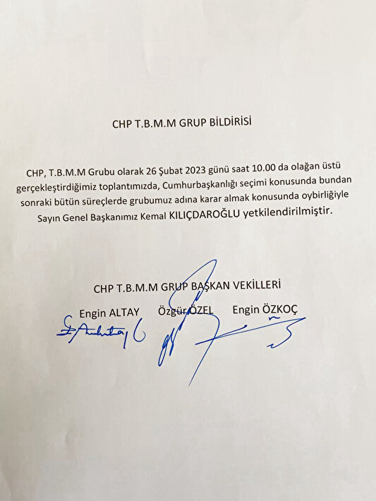 "CHP TBMM grubu olarak 26 Şubat günü olağanüstü gerçekleştirdiğimiz toplantımızda cumhurbaşkanlığı seçimi konusunda bundan sonra bütün süreçlerde grubumuz adına karar verme sürecinde oybirliğiyle Sayın Genel Başkanımız Kemal Kılıçdaroğlu tam yetkilendirilmiştir"