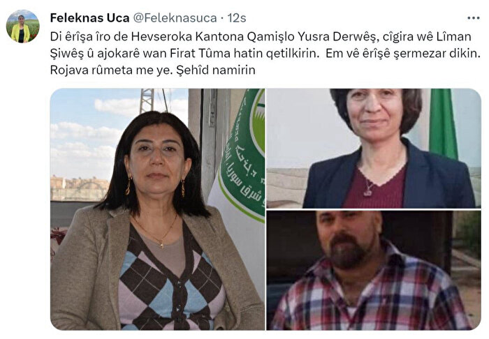"Bugünkü saldırıda Qamişlo Kantonu Eşbaşkanı Yusra Derwêsh, yardımcısı Liman Şiwêsh ve şoförleri Fırat Tûma hayatını kaybetti. Bu saldırıyı kınıyoruz. Rojava bizim onurumuzdur. şehitler ölmez."