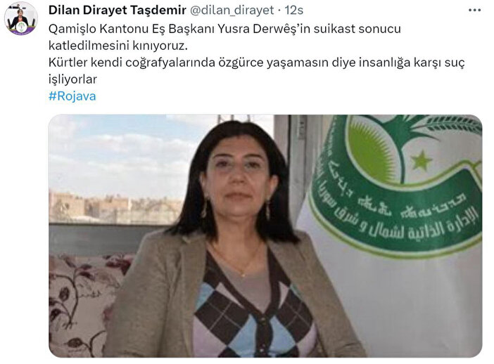 "Qamişlo Kantonu Eş Başkanı Yusra Derwêş’in suikast sonucu katledilmesini kınıyoruz. Kürtler kendi coğrafyalarında özgürce yaşamasın diye insanlığa karşı suç işliyorlar."