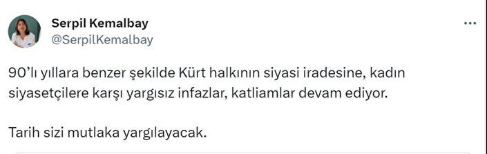 "90’lı yıllara benzer şekilde Kürt halkının siyasi iradesine, kadın siyasetçilere karşı yargısız infazlar, katliamlar devam ediyor. Tarih sizi mutlaka yargılayacak."