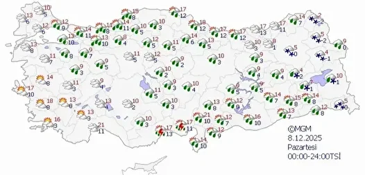Meteorolojinin son değerlendirmelerine göre, yurdun büyük bölümünde yeni haftada hava daha da soğuyor. Ayrıca 8 ile kar yağışı uyarısı yapıldı. Yağışların Batı Karadeniz kıyıları ile Mersin, Adana, Bingöl, Muş ve Hakkari çevrelerinde yer yer kuvvetli olması bekleniyor.