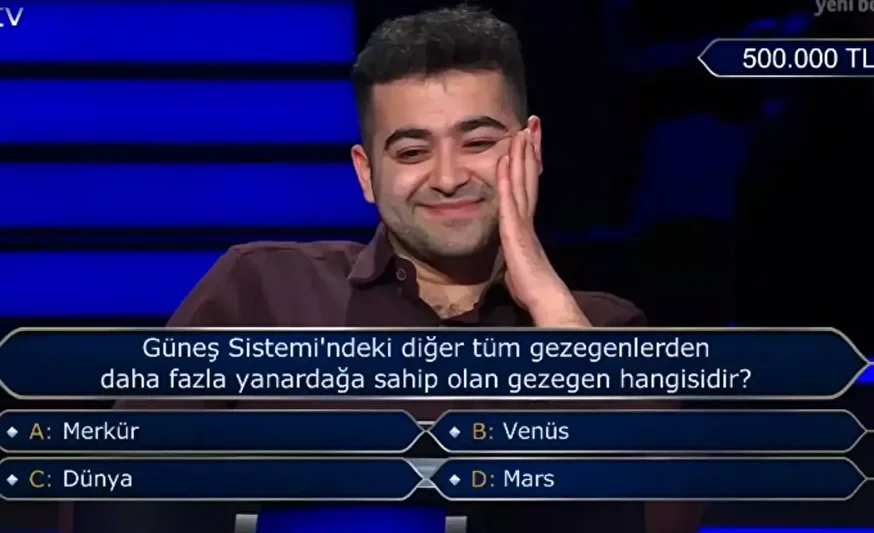 Güneş Sistemi'ndeki diğer tüm gezegenlerden daha fazla yanardağa sahip olan gezegen hangisidir? Her hafta beğeniyle takip edilen Kim Milyoner Olmak İster bilgi yarışmasının 14 Aralık 2025 tarihli yeni bölümünde sorulan sorunun yanıtı izleyiciler tarafından merak edildi. 500 bin TL değerindeki bu sorunun doğru cevabı haberimizde.