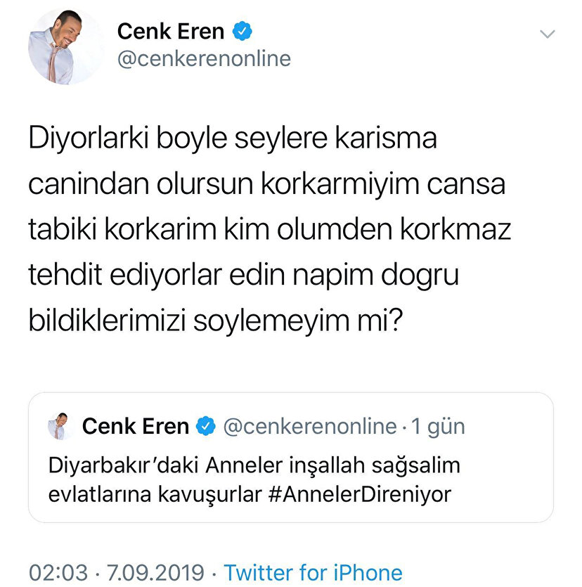 Diyarbakır'da HDP binası önünde evlat nöbetinde bulunan annelere destek verdiğini duyuran ünlü sanatçı Cenk Eren tehdit edildiğini duyurdu. Sosyal medya hesabı üzerinden açıklama yapan Eren, "Diyorlarki boyle seylere karisma canindan olursun korkarmiyim cansa tabiki korkarim kim olumden korkmaz tehdit ediyorlar edin napim dogru bildiklerimizi soylemeyim mi?" dedi.
