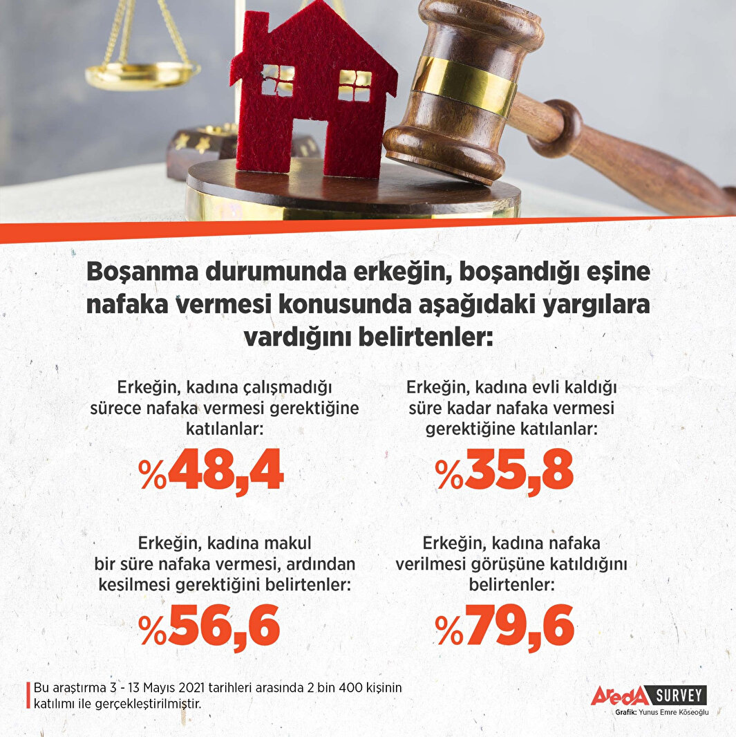 - Araştırmada, toplumun yüzde 79,6’sının erkeğin kadına nafaka vermesi gerektiğini düşündüğü ortaya çıktı.
