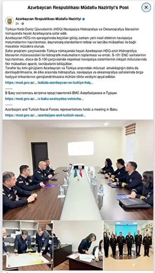 В рамках программы визита турецкая делегация провела обмен мнениями со специалистами Гидрографического управления ВМС Азербайджана и поделилась накопленным опытом по вопросам сбора и обработки гидрографических данных, подготовки электронных навигационных карт S-101 ENC, а также развития цифровых навигационных систем в соответствии со стандартом S-100.