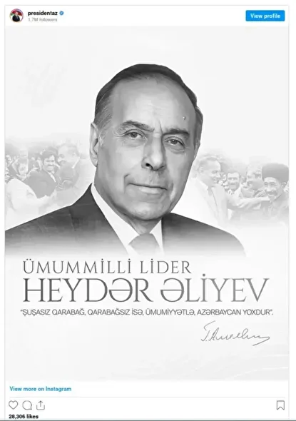 Президент Азербайджана Ильхам Алиев обнародовал в соцсети «Инстаграм» публикацию в связи с днем памяти великого лидера Гейдара Алиева.