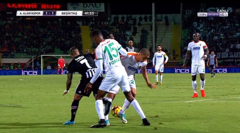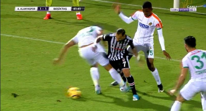 Beşiktaş'ın Alanyaspor'a konuk olduğu maçın 40. dakikasında Ricardo Quaresma, ev sahibi ekibin ceza sahası içerisinde yerde kaldı. Hakem Yaşar Kemal Uğurlu pozisyona 'devam' kararı verirken siyah beyazlı taraftarlar pozisyona penaltı verilmemesine tepki gösterdi.