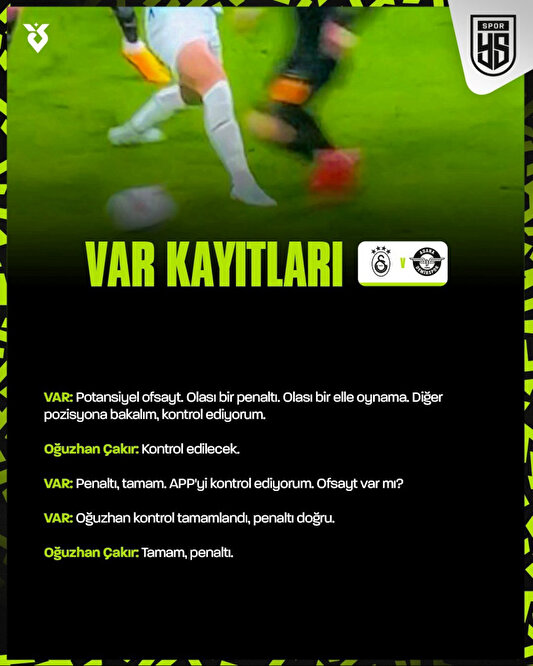 - 3. hafta oynanması gereken ancak erteleme nedeniyle 17 Eylül 2024 tarihinde oynanan Galatasaray – Gaziantep FK mücadelesinde Gaziantep FK oyuncusu Saborit’in Barış Alper Yılmaz’ın hayati risk taşıyan kafasına yükselerek kramponlarının çivilerinin denk geleceği şekilde kafasına basmasıyla ilgili çıkması gereken kırmızı kartın öncesinde, kaldırılan ofsayt bayrağı nedeniyle iptal edilen pozisyon; aynı mücadelenin 57. dakikasında Kaan Ayhan’ın yaptığı ortada Gaziantep FK’lı oyuncunun elle müdahalesiyle ilgili pozisyon;