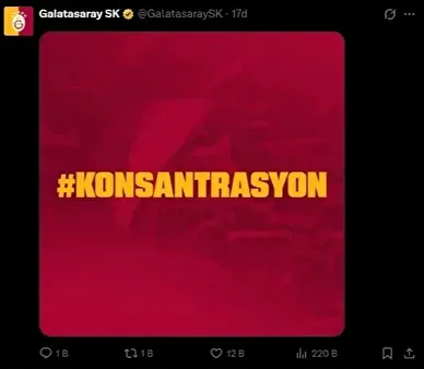 TFF Başkanı İbrahim Hacıosmanoğlu'nun Galatasaray'a yönelik sözlerinin ardından Galatasaray'dan dikkati çeken bir paylaşım yapıldı. Hacıosmanoğlu'nun konuşması biter bitmez sarı-kırmızılı kulübün sosyal medya hesabından "Konsantrasyon" paylaşımı yapıldı. Bu gönderi Hacıosmanoğlu'na cevap olarak yorumlandı.