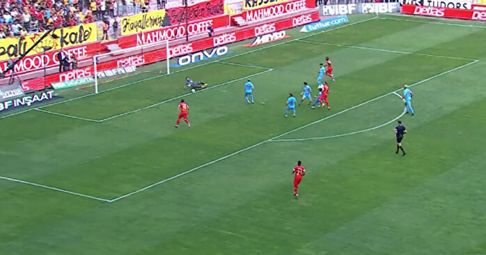 9. dakikada Kayserispor'da Bernard Mensah'ın savunma arkasına pasında Mame Thiam, topla buluştu. Senegalli oyuncunun ağlara gönderdiği top, ofsaytta olması nedeniyle gol değeri kazanmadı.