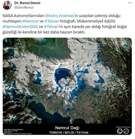 "NASA astronotlarından Andreas Mogensen'ın uzaydan çekmiş olduğu muhteşem Nemrut ve Tatvan fotoğrafı. Mükemmeliyet ödüllü Nemrut Krater Gölü ve Tatvan’ın aynı karede yer aldığı fotoğraf doğal güzelliği ile kendine bir kez daha hayran bıraktı."