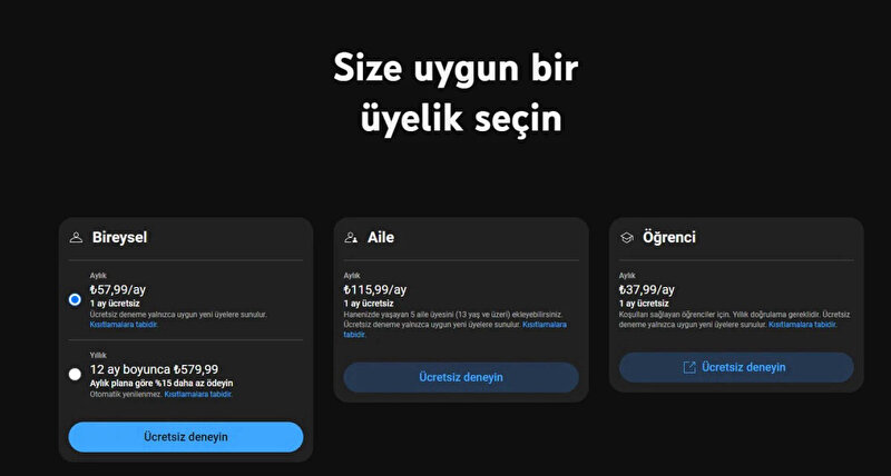 - Bireyselkullanıcılar için aylık 29,99 TL'den aylık 57,99 TL'ye,